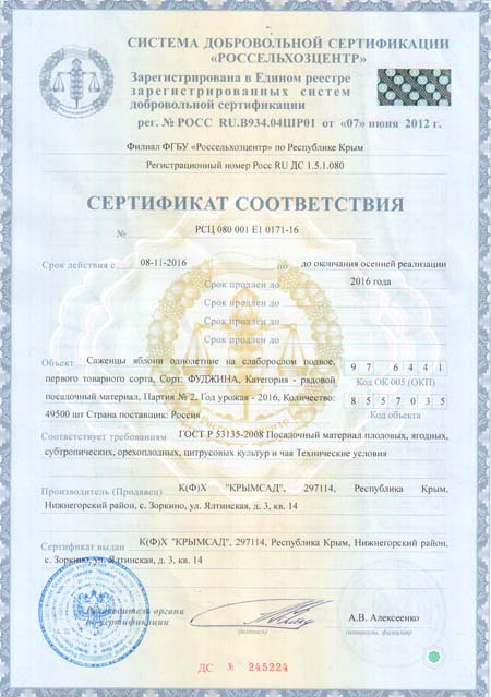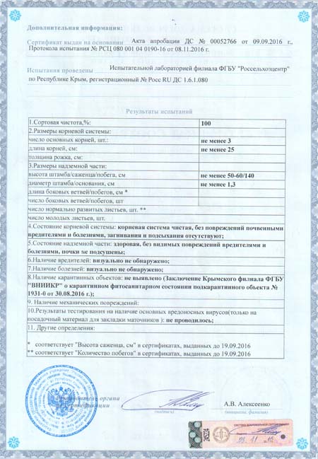 Все саженцы имеют сертификаты соответствия и акты апробации.